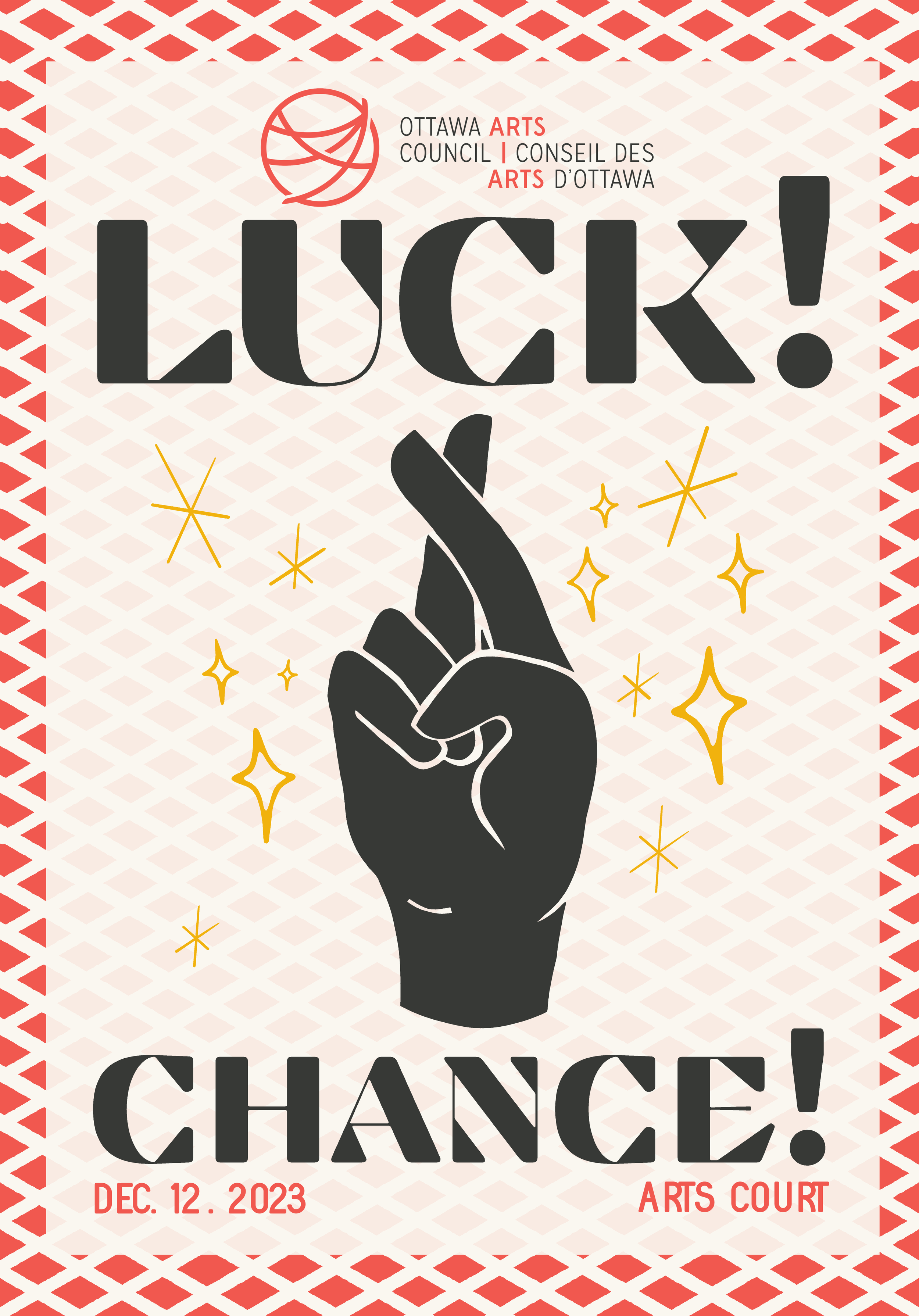 ….LUCK! 2023 will focus on raising funds for a new micro-grant program the Council piloted in 2021 that will offer Ottawa artists (working in visual arts, theatre, literary arts, music and beyond) quick and simple access to smaller funding amounts ($500-$1,000) to help with subsistence, travel, materials, marketing- whatever they need to support and ignite an arts practice. ..CHANCE ! 2023 sera consacré à la collecte de fonds pour un nouveau programme de micro-subventions que le Conseil a mis à l'essai en 2021 et qui offrira aux artistes d'Ottawa (travaillant dans les domaines des arts visuels, du théâtre, des arts littéraires, de la musique et autres) un accès rapide et simple à de petits montants de financement (500 à 1 000 $) pour les aider à assurer leur subsistance, à voyager, à se procurer du matériel, à faire du marketing - tout ce dont ils ont besoin pour soutenir et stimuler une pratique artistique. ….